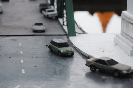 Miniature Cityscape Featuring Toy Cars on a Detailed Roadway, Bridge, and Scenic Elements