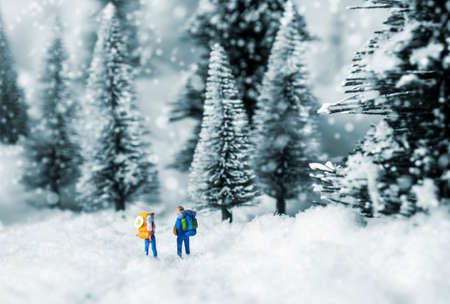 Miniature people - a couple of lover girl friend, twins, traveller with beautiful nature bokeh background