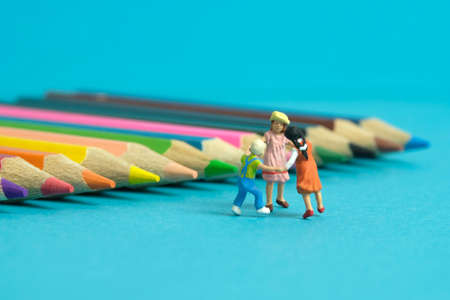 Miniature people toy figure photography. Drawing class concept. A group of kids playing on colorful pencil, isolated on blue background. Image photo