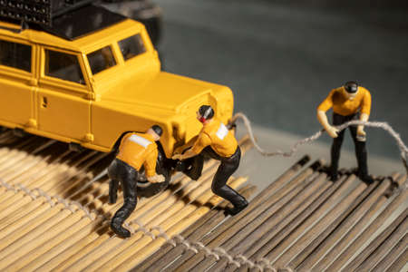 concept of trying to cross bridge obstacle with miniature people and 4x4 all-terrain vehicle