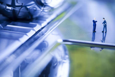 Travel and transportation Concept. Close up of group of traveler miniature figure with backpack standing with mini toy van model.