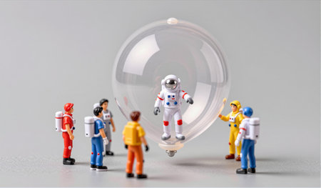 A group of colorful astronaut figurines surrounds a floating astronaut in a transparent sphere. This imaginative scene highlights teamwork and adventure in space exploration.