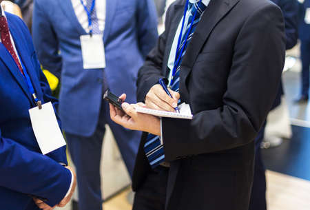 A man in a jacket with a dictaphone interviews a businessman and writes to a notebook. Close-up