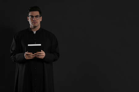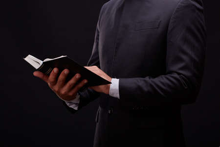 Low angle portrait of Black man as priest reading Bible in church office preparing for Sunday sermon, copy space