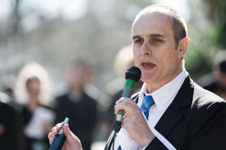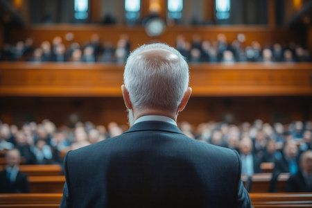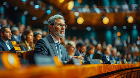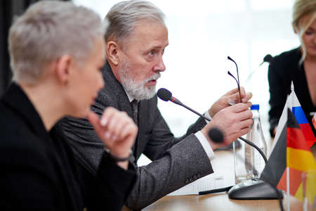 Elderly politician speaking to audience at government or political meeting in parliament or congress building