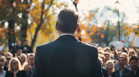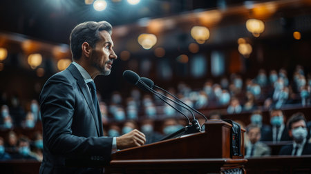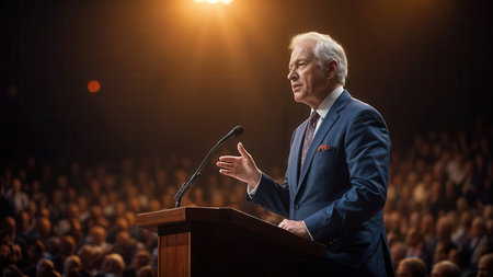 A politician speaks passionately at a podium in front of a large audience. The scene captures leadership, public engagement, and political discourse in a formal setting.