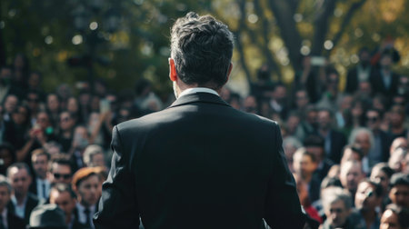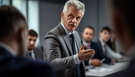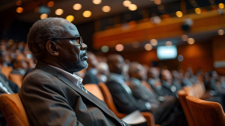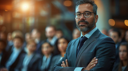 Confident businessman delivering powerful keynote to diverse audience at conference