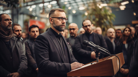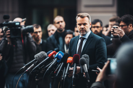 A politician delivers an energetic statement at a press conference surrounded by journalists and camera flashes, creating an engaged atmosphere for the event.