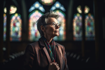 Mature caucasian male preaching in church with congregation and stained glass windows.