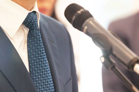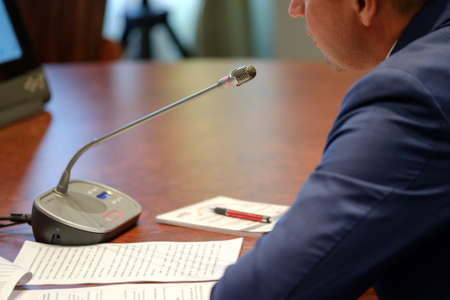 Microphone in focus at news conference or business presentation, blurred people in the background
