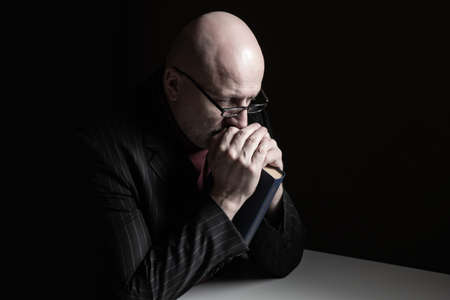 Man with a book in a dark room. Concept - that he has a Bible in his hands. Closed Bible in hands of a man. Grown man thinks about God. He sits at table. Human praying with bible in hands.