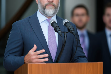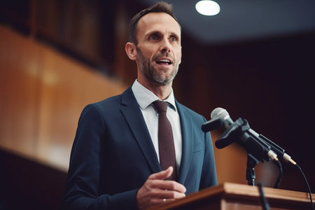 A man in business attire stands confidently at a podium, addressing an audience with a microphone in front of him.