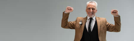 cheerful middle aged groom in suit with floral boutonniere gesturing isolated on grey, banner