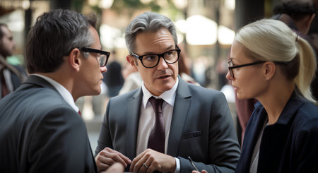 Mature businessman in eyeglasses talking to his colleagues on the street