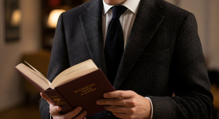 A close-up mid-section of a man wearing a formal dark grey tweed suit, white shirt, and dark tie. He is holding and reading a book with a burgundy cover. The image suggests intelligence, study, or formal business.