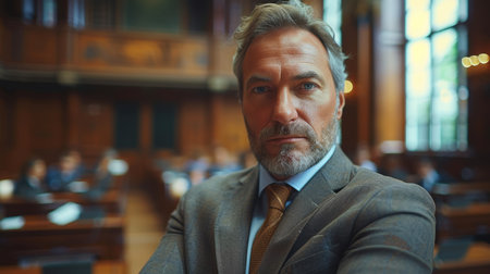 Lawyer confidently stands in a courtroom, embodying both professionalism and undeniable authority. Generative AI