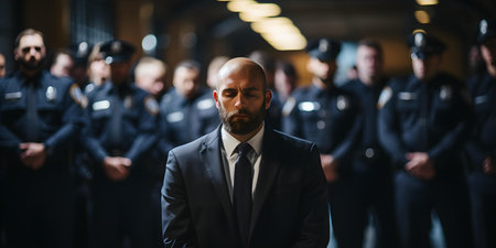 Exhausted person with head down surrounded by law enforcement officials nearby. Concept Police encounter, Unrest, Stressful situation, Emotional breakdown, Law enforcement presence