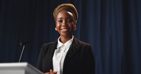 Black woman, speaker and portrait with mic for speech, congress or political statement on podium. Event, female person or African politician with seminar for government pitch, democracy or election