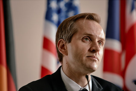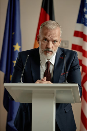 Portrait of middle aged Caucasian man standing at podium delivering speech, looking into camera with serious expression, European Union, German and United States flags in background