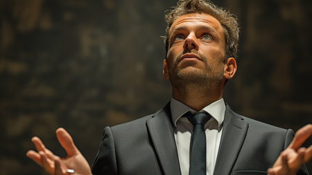 Portrait of a handsome businessman in a suit speaking at the conference hall