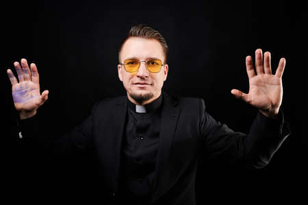 Priest man in yellow glasses wearing catholic robe happy face smiling. Man hands up. Positive person.