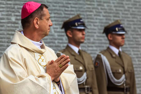 Catholic priests near Memorial wall with the names of Poles, victims of Stalinist repressions at the Polish military cemetery Polish graves in Bykivnia near Kyiv. Ukraine. September 2012