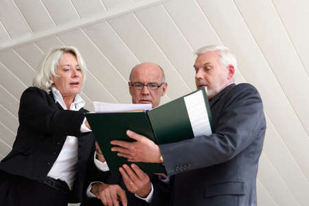 Business people wear suits and carry documents to walking and talking together. Business partnership meeting concept. Business people talking and discussing work in building hallway.