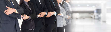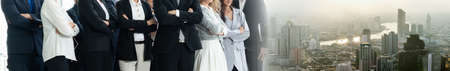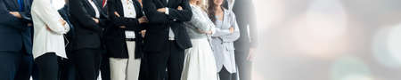 Many business people meeting standing in row with arms crossed and confident. Company organization employee unity and support. Concept of corporate partnership and human resources growth management.