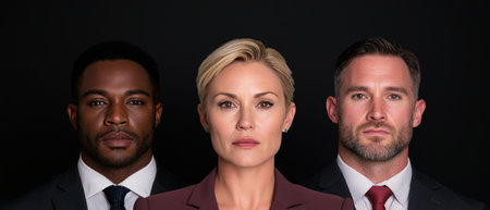 Professional business team standing confidently in modern office environment, showcasing teamwork and collaboration. Their expressions convey determination and success