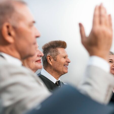 Group of serious professionals standing side by side, attentively listening to an engaging speaker during an important business seminar