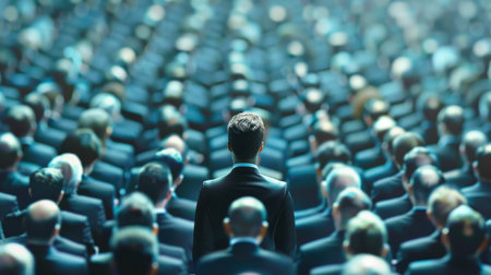 A worker stands confidently, distinctly visible among a large crowd of corporate professionals, highlighting individuality in a formal environment.