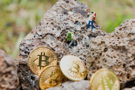 Cryptocurrency concept with miners and coins working in bitcoin mine.