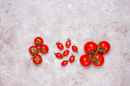 Arrangement of colorful fresh assorted tomatoes on light concrete background,top view