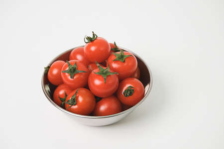 Bouquet of fresh ripe cherry tomatoes ready to eat on a bright white background
