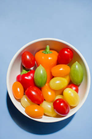Bowl with small tomatoes and peppers on a blue background with copy space. Fresh garden vegetables concept
