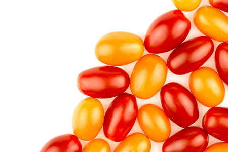 Red, yellow and orange plum-shaped tomatoes on a white background. Isolated.