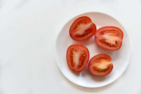 Sliced red tomato on a white plate. Vegetarian food. top view. healthy eating.