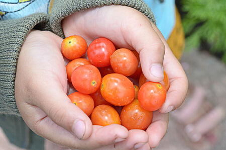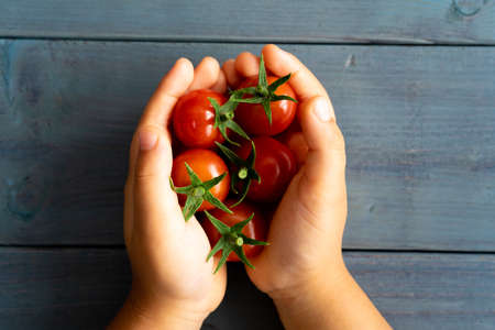 Child's hand holding cherry tomato