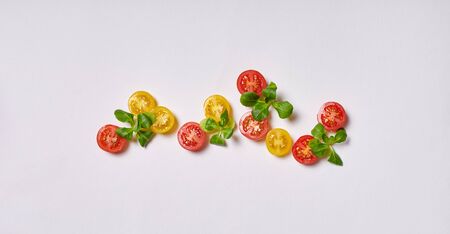 Fresh halved cherry tomatoes and herbs isolated on white background healthy diet
