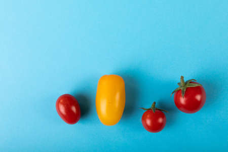 Overhead view of copy space with fresh red and yellow tomatoes on blue background. unaltered, organic food and healthy eating concept.