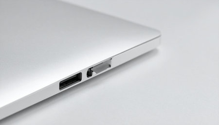 A detailed macro shot highlights the essential connectivity ports of a sleek, modern laptop.