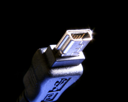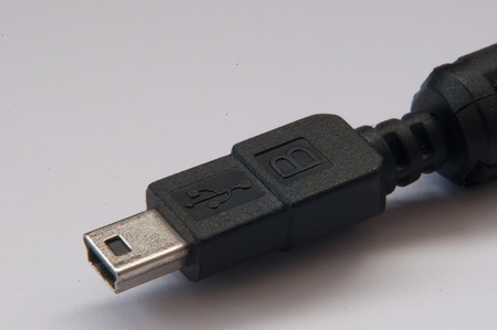 Closeup of a USB cord with the mini connector. Focus is on the connector