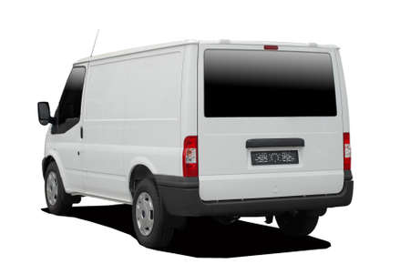 Rear of a model white van with blank door panels for your own branding, isolated on white with clipping path.