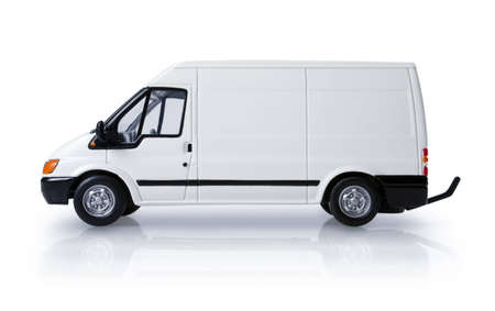 White model van, side view with blank panels to add your own branding, isolated on a white background with clipping path provided.