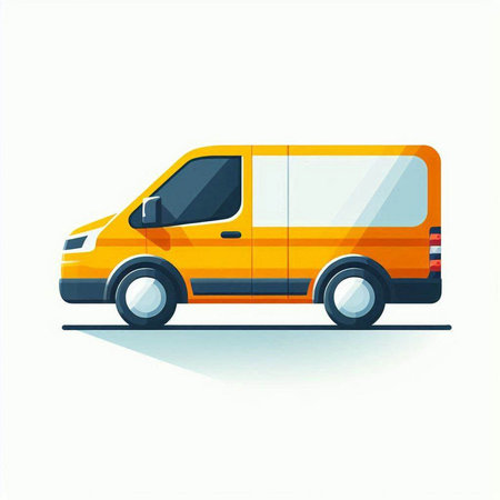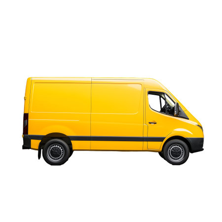 A side view of a bright yellow delivery van against a transparent background, perfect for business or transportation themes. Represents efficiency and reliability in logistics and courier services.