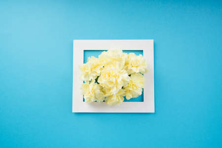 Romantic Spring flower arrangement with pink roses , pink carnation and white frame on a pastel blue background. Minimal concept. flat lay.