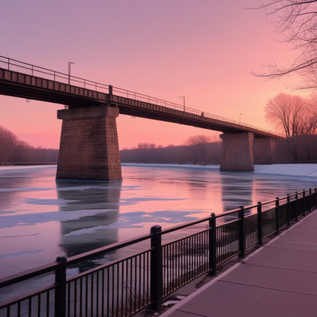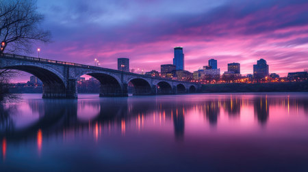 A bridge spans a river with a city in the background. The sky is a mix of blue and orange, creating a serene and peaceful atmosphere