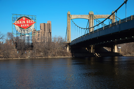 MINNEAPOLIS-MINNESOTA, APRIL 1, 2018: a 48-foot-high sign with the Grain Belt logo, illuminated by a mix of neon tubes and incandescent bulbs next to the Hennepin Avenue Bridge in Minneapolis