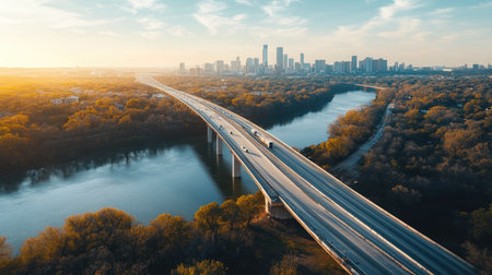 A high-resolution photo of a modern expressway bridge over a river, with vehicles crossing and the city skyline visible in the distance.