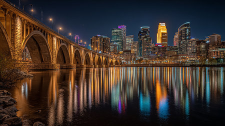Long exposure captures Stone Arch Bridge over Mississippi River in Minneapolis, USA. Illuminated arches reflect in flowing water under a night sky